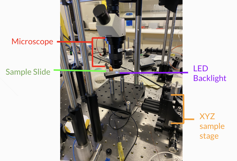 In the above image, you can see that the LED backlight is literally a simple semisphere-headed circuit board LED jammed into the middle of a component for something else, soldered with two copper wires that were alligator-clipped to an outlet, with a glass slide sat on top. This, again, required quite a bit of first principles understanding of backlit microscopes and optics, which I enjoyed.